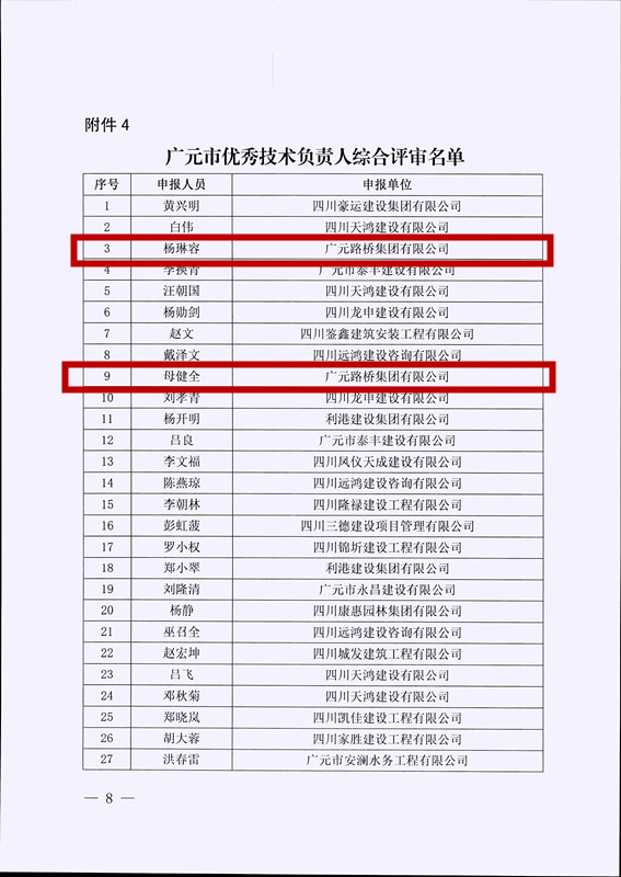 2023年7月1日,廣元路橋集團有限公司被廣元市住房和城鄉(xiāng)建設(shè)局評為優(yōu)秀建筑企業(yè);陳文輝被評為“廣元市優(yōu)秀項目經(jīng)理”;母健全、楊琳容被評為“廣元市優(yōu)秀技術(shù)負責人”。